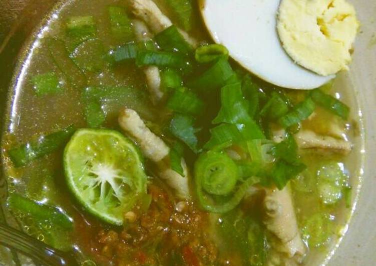 - Hidangkan Soto Tulang Ayam ke mangkuk, taburkan daun bawang diatasnya, dan peras jeruk limo agar segar, tambahkan sambal dan soto pun siap dihidangkan..