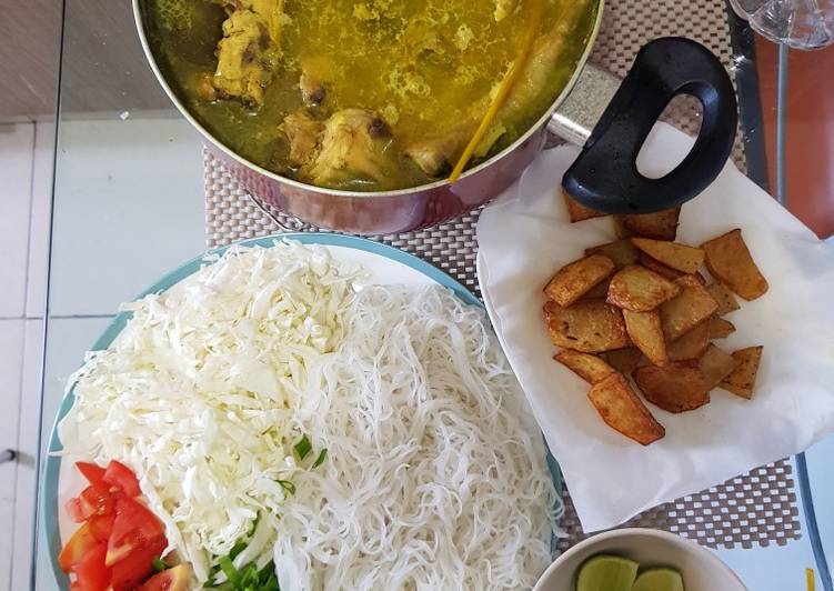 - Penyajian : masukan ke mangkuk, soun, kentang goreng, kol, bawang daun, lalu tuang soto ke dalam mangkuk (bisa ditambahkan rebusan telur) tambahkan sambal dan irisan jeruk nipis..